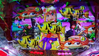 最初の台は、本日4連+2連した200回転手前のの台でした。沖縄モード+「お座り一発」+ステップアップ3魚群+右タテ「ハリセンボン」+シーサーリーチ→外れ。「お座り一発」の魚群外れは、すぐに引き戻さないとハマります。