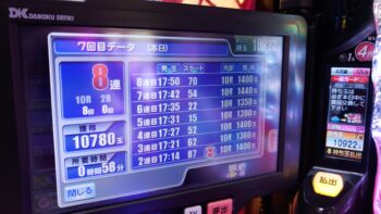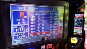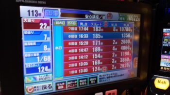 少ない空き台の中で、前々日8回、前日17回の台がありました。初当たり1回目が、124回転で2連。2回目が、168回転で3連。3回目が、154回転で2連。4回目が、189回転で4連。5回目が、171回転で2連の甘デジのような台でした。174回転で空いていました。