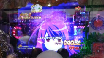 最初は「Pフィーバー アイドルマスター ミリオンライブ!39フェスver.」の1回当たりの台で「お座り一発」で「39フェス」に入れましたが、「7」9R当たりを引けず、5連で1300玉ほどしか出ませんでした。「即ヤメ」して他の台で出玉をなくして「P麻雀物語4」のシマへ行きました