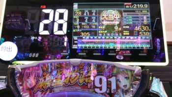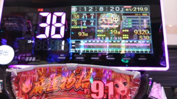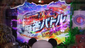 投資7Kの246回転、「青」→「緑」→「赤」保留+マシロ連続予告×3+スペシャルカットイン予告+役満乱舞ZONE+麻雀SPリーチ+共闘+九連+カットイン「金」→「8」3R当たり。「激闘!麻雀バトル」に突入しました。