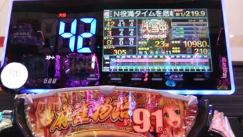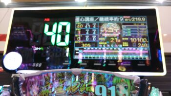 空いていたのは、前々日4回、前日41回の台で、初当たり1回目が、64回転で6連、初当たり2回目が、95回転で13連、140回転で空いていました。