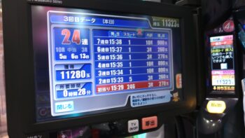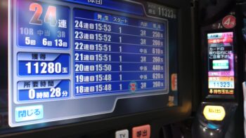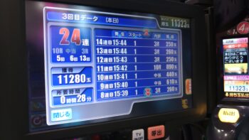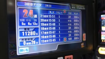 今日は、一撃24連で出玉が12580玉、差玉で11323玉出ました。
