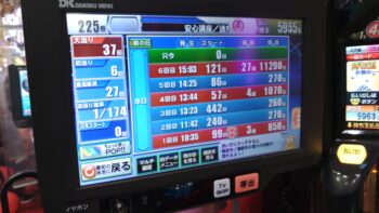 空いていたのは、前々日32回、前日40回の台で、初当たり1回目が、99回転で3連、初当たり2回目が、240回転で通常当たり、、初当たり3回目が、442回転で通常当たり、初当たり4回目が、57回転で4連、初当たり5回目が、86回転で通常当たりの消化不良の台で、41回転で空いていました。
