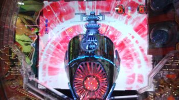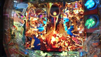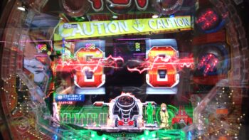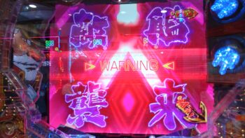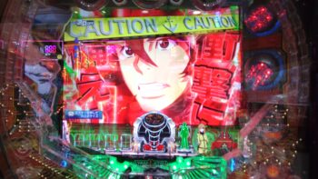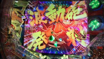 再度打ち出した、僅か22回転で、CAUTION前兆予告+「青」→「緑」保留+「主砲役モノ」赤エフェクト+十ゾーン+「波動砲役モノ」赤エフェクト+会話予告「金」+波動砲リーチ+「緑」カットイン→「6」2R3当たり。