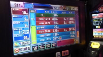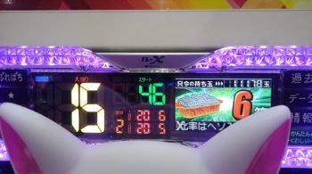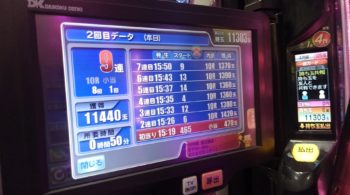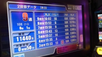 本日、初当たりが96回転で6連で457回転の台でした。