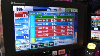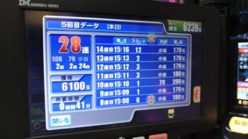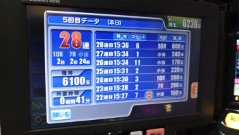 28連しました。総投資が17Kで、出玉は7807玉ほどでしたが、最終的に差玉が6239玉の換金22.2Kで、プラス5.2Kでした。