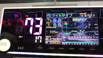 前々日45回、前日59回当たりで、本日の初当たりが3回転で7連、2回目が74回転で24連、3回目が55回転で13連、4回目が68回転で単発スルーで、83回転で空いていました。