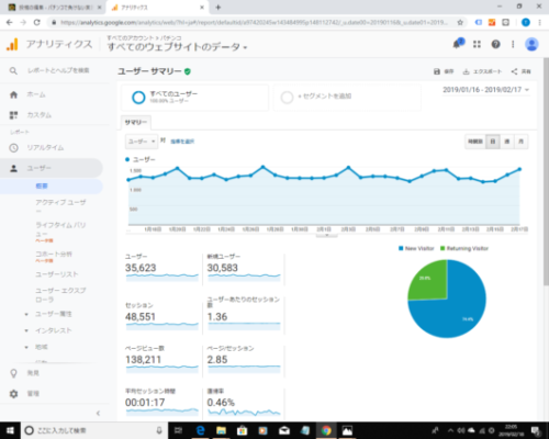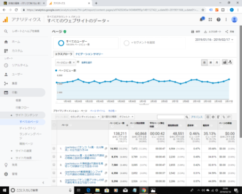 今回の2019年の2月はアクティブユーザー数が1,180/日、35,600/月でページビュー数が4,600PV/日で138,000PV/月と微増しました。