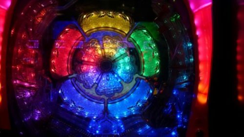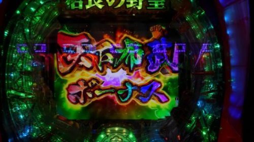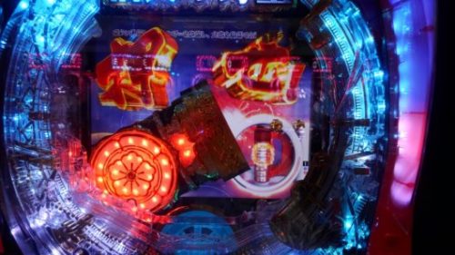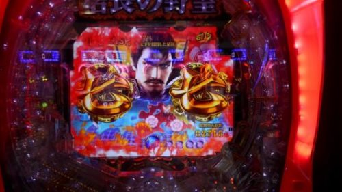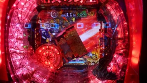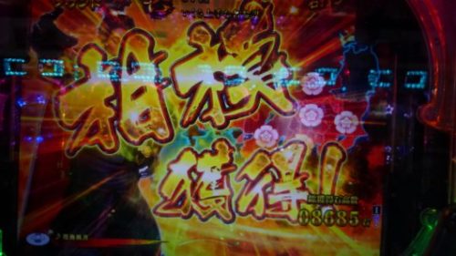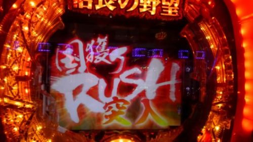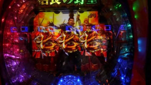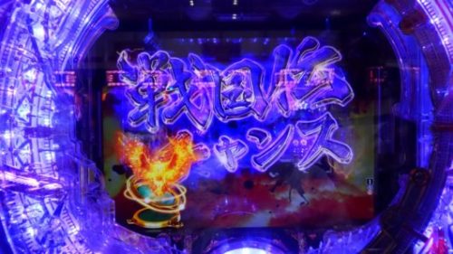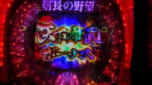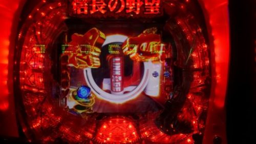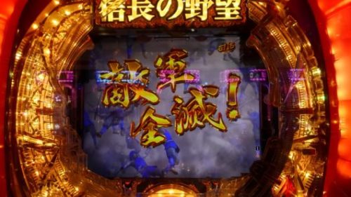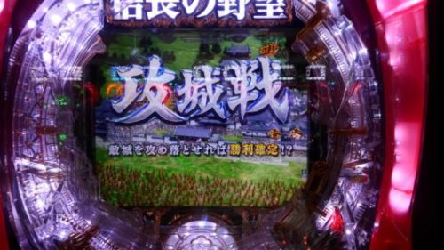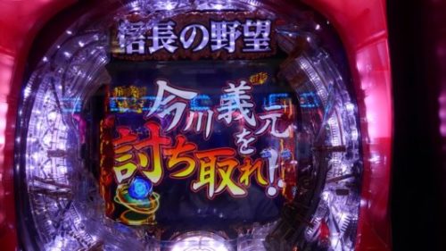 6連したのでいつものように止め時を考えていましたら、、6連後の時短中89回転で「覇王進撃ゾーン」+「青」保留+疑似連×3+「極大砲可動体発射」+大名発光演出「赤」+「剣舞演出」+ロゴ落下+ストーリーリーチ「桶狭間の戦い」→「2」→「天下布武ボーナス」15R確変当り。「国盗りRUSH」に再突入しました。