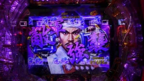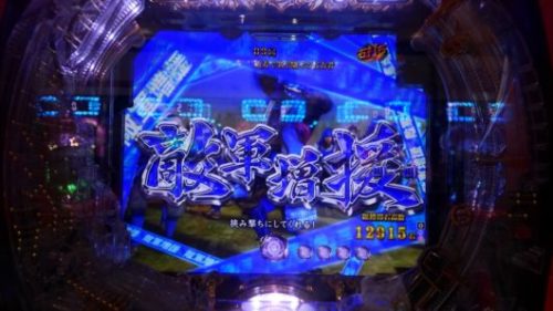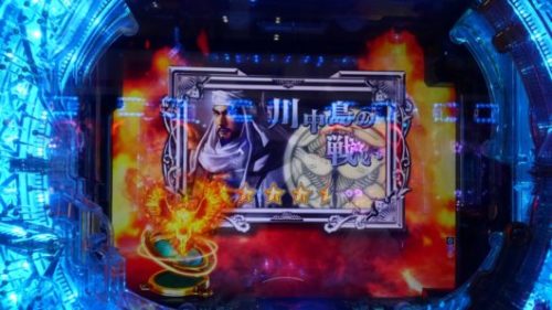 投資、7Kの498回転で、保留3個目にいきなり炎鷹保留(金鷹保留の次)がキュインと入りました。疑似連×3+大名発光演出「赤」+「剣舞演出」+ロゴ落下+戦国伝リーチ「川中島の戦い」→「2」→「9」5R確変当り。「国盗りRUSH」に突入しました。
