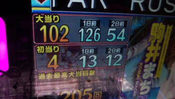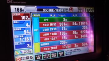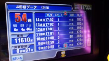 前々日より54回、前日126回の台でした。初当たりが、16回転で7連、2回目が、136回転で40連、3回目が、77回転で通常当たりで86回転の台でした。