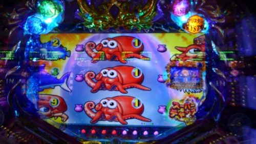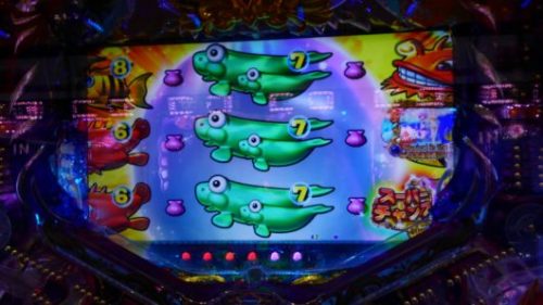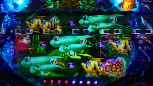 ST中は、今にも当たりそうな「ガセ」がたくさんありましたが、STも時短もスルーだなと思った98回転、トレジャーステージ+魚群+マリンリーチ→「ハリセンボン」当たり。この回転数なら、電チュー保留ですからST突入濃厚なことで嬉しいあり得ない当たり1度目です。