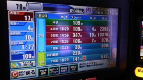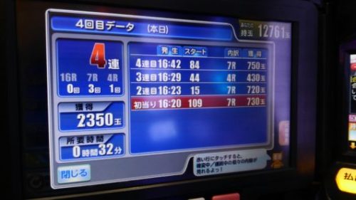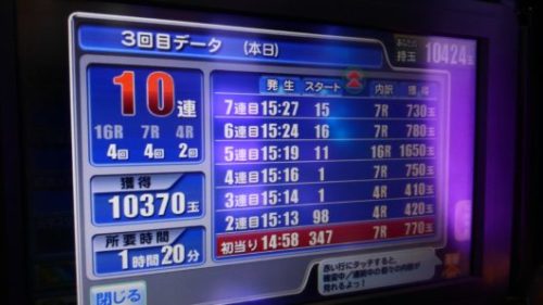 本日、初当たり1回目が、39回転で通常当たりもしくはST50回転+時短50回転スルーの台でした。初当たりがわずか2連で250回転で空いていました。普段は座らない回転数の台でした。