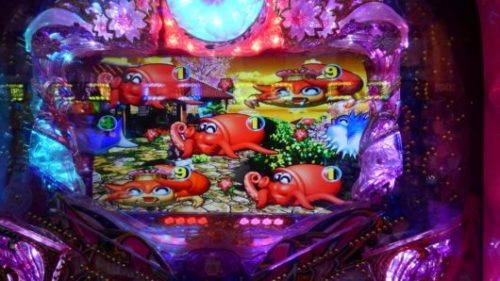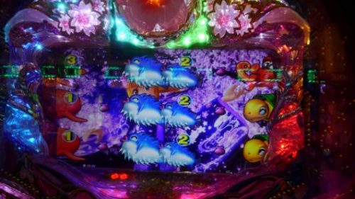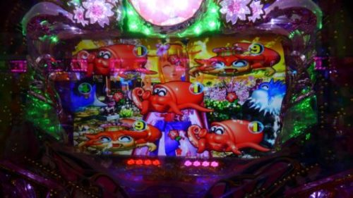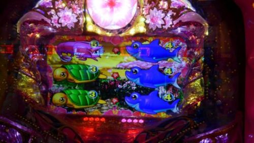 1回目のレア当たりでした。いつもの通り、大当たりラウンド消化後は、すべての保留を消化しました。電チュー保留なしの状態なので4回転、最後の保留+千本桜ゾーン+「タコ」当り。