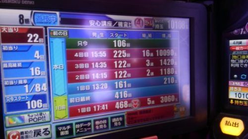 この台は通常当りが多すぎです。時短80回転もスルーしました。回収月も手伝っているので、暫く遊戯もスルーします。