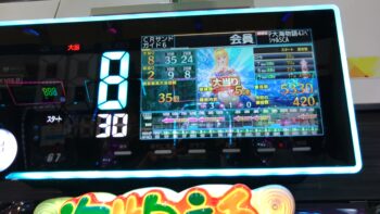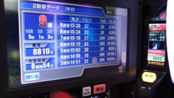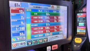 前々日より24回、前日35回の台でした。初当り1回目が、73回転で3連して107回転の台でした。前日によく出ていたので敬遠されていたみたいです。