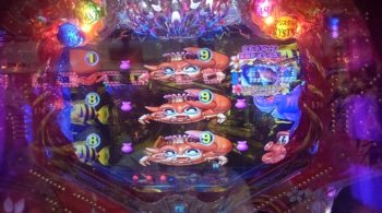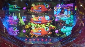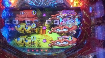 投資3.5Kの358回転、トレジャーステージ+「魚群」+左タテ「サメ」+宝の山リーチ→「サメ」5R当たり。