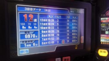 絶対に連チャンする自信をもって座りました。先ほど書きました通り、初当たり1回目は379回転で3連。2回目が120回転で5連していて368回転で空いていました。