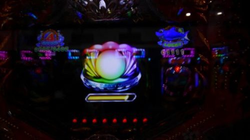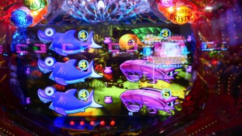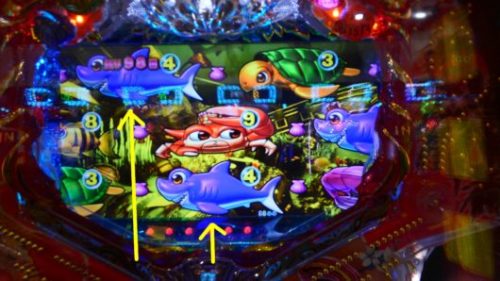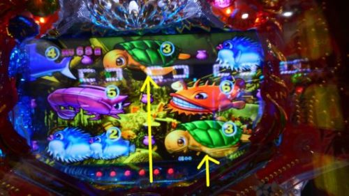 私は、ずっと「CR 海物語」系を打ってきて、最近気なる出目は下記画像のセンター図柄のズレ目です。「激アツ」ウリンチャンスの不揃いなのですが、この出目が出ると大当たりが近いと思い込んでいます。