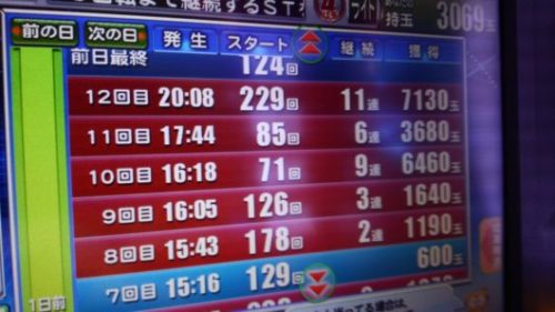 上のデータランプの8回は当日で2日前が48回当りとなっています。私が11回目の初当りで6連してやめたのですが、その後、229回転ハマって11連していました。プラス
