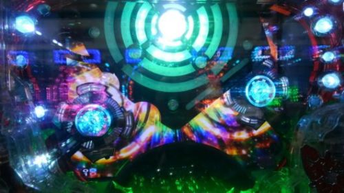大当たり即ヤメ台でしたので時短込みで50回転です。いきなりセンターの役物が落ちたり、「緑」保留になったりオカルトですが、当たる気満々台です。