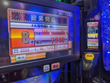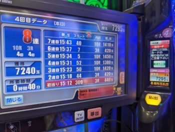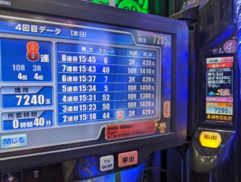 前々日より7回、前日17回の台でした。初当たり1回目が、343回転で7連、2回目が、298回転で10連、3回目が、152回転で、単発スルーで204回転の台でした。単発スルー後は少し嫌でしたが、連チャンした実績から、次の連チャンに期待しました。