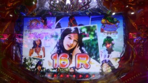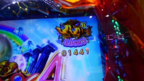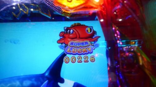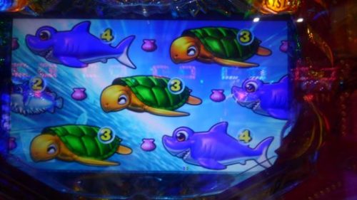 8個保留が良く満タンになるので喜んで回していたら、保留満タン時に宝箱の5つ目に「アグネス」保留が出現しました。4回転前から「スペシャルアグネスタイム」→魚群+宝の山リーチ→「カメ」当たり。ラウンド昇格して16R確変でした。