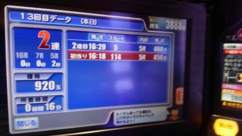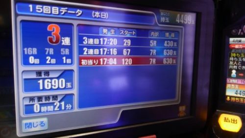 初当り13回目114回転、2連。14回目105回転、2連。15回目120回転、3連。16回目45回転単発