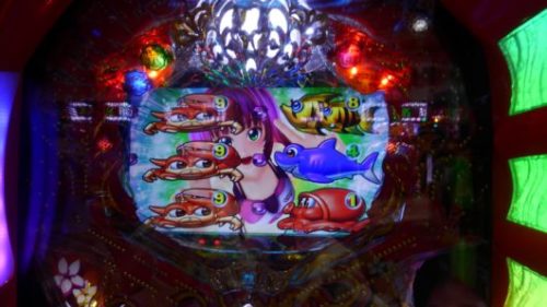 先ほどの初当りが「タコ」の7Rでしたので10回転+60回転の時短が70回転でした。その70回転の3回転手前の67回転でトレジャーステージ+ビッグバイブ+魚群+宝の山リーチ→「カニ」当り。3連目は29回転で「ヤッコ」当りでした。