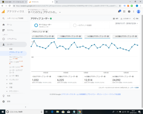 今回の12月はアクティブユーザー数が1,032/日、32,000/月でページビュー数が3,300PV/日で104,000PV/月と微増しました。50記事追加のデータといえます。