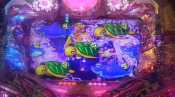3連目は、時短中の45回転、沖縄モード+魚群+マリンリーチ→「サメ」4R当たり。