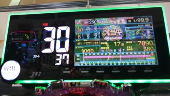 保留消化したら、ストップボタンを放して打ち出すだけです。この後はリーチすらかからないと30回転で保留消化して、音量、光量ボタンが表示されてから打ちっぱなしにしています。