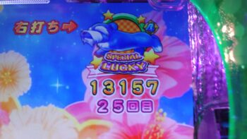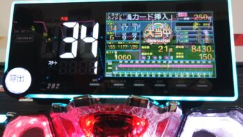 ところが投資、8.5Kの222回転(1K14)で、 チャンス目3回+ノーマルリーチ→「2」ダックス4R当たりしてしまいました。時短の引き戻しで勝負です。