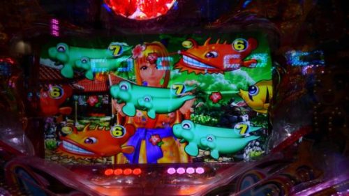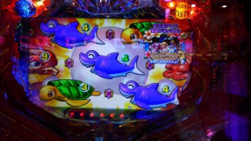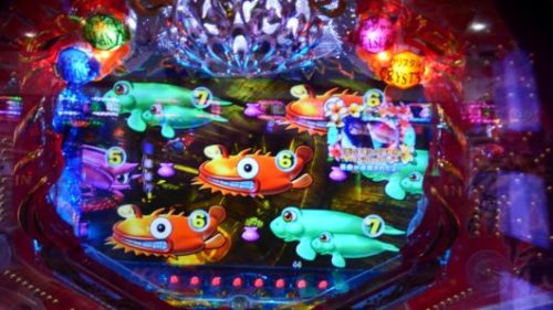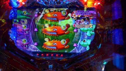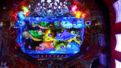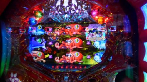 僅か47回転、トレジャーステージ+魚群+宝の山リーチ→「ジュゴン」当り。2連目、8回転「エビ」当り。3連目、4回転「タコ」当り。4連目、10回転「タコ」当り。5連目、27回転「アンコウ」当り。6連目、6回転「タコ」当り。7連目、1回転「タコ」当り。