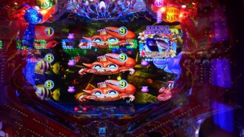 投資、2.5Kの75回転、トレジャーステージ+ビッグバイブ+魚群+マリンリーチ→「カニ」当り。2連目、8回転「サメ」当り。