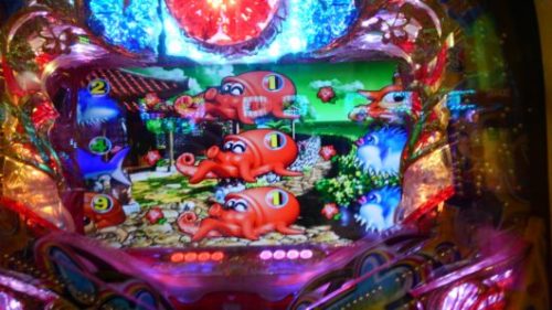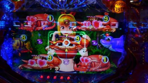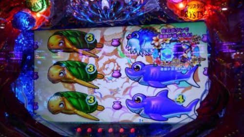 投資、1Kの87回転、クリスタル+パールフラッシュ+クロスリーチ→「タコ」当り。9回転、「サメ」当り。
