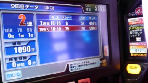 今日もよく似た台でした。昨日に37回当りの時に少し打っていたのですが、ヤメて上の台に移動したのですが、この台はこの後に9連して46回当りまで大当たり回数を伸ばしていました。後で打った台も連チャンしてくれてよかったのですが……。