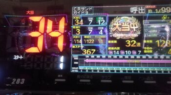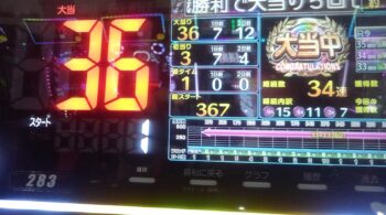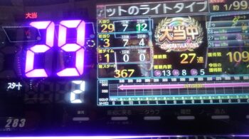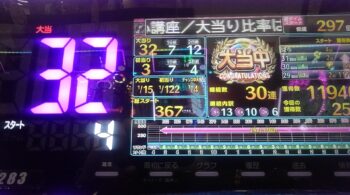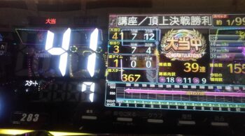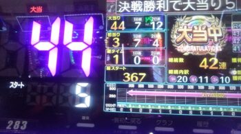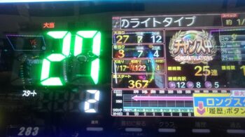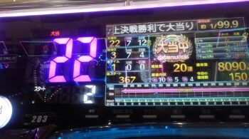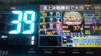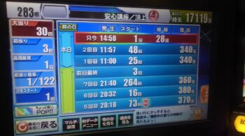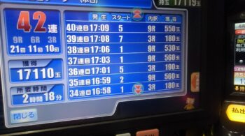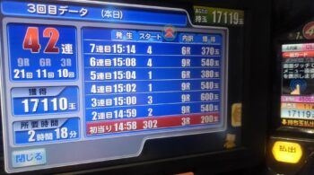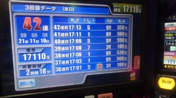 空いていたのは、前々日12回、前日7回の台で、初当たり1回目が、25回転で頂上決戦スルー。初当たり2回目も、頂上決戦スルーして、114回転で空いていました。