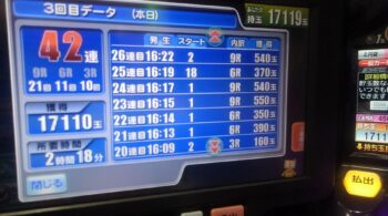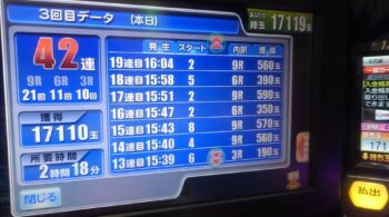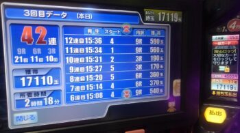 今日は、一撃で出玉が20000発オーバーで差玉でも17119発出ました。まさしく甘デジの出玉ではありません。