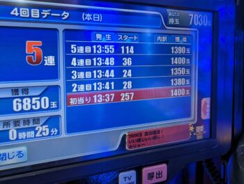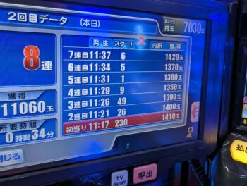 前々日21回、前日27回当たりで、本日の初当たりが、1回目が9回転で2連。2回目が280回転で8連。3回目が307回転で6連。4回目が257回転で5連して、167回転で空いていました。この時点で出玉が30000発以上の台でした。