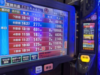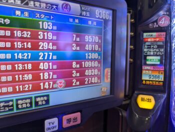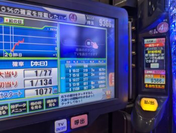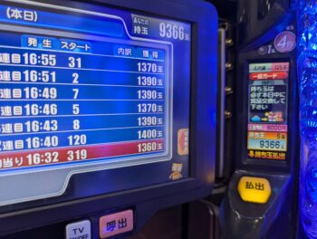 本日の初当り確率が、なんと1/134で大当たり確率は1/77でした。平均連チャン回数は、4.2連チャンでした。絶好調台でした。