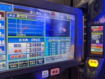 総投資が、10Kで出玉が10755玉で差玉は8460で最終的にトータル9112玉ありました。換金32.4Kのプラス22.4Kでした。この台の本日の差玉が、終了時点で、31880玉でした。