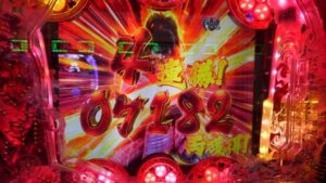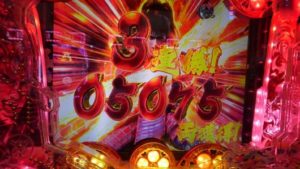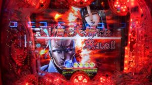 投資1Kの154回転目、画面ロック+「ボタンバイブ」+「白」保留+「好機」+「八」テンパイ+SPロングリーチ「拳の熱さ」→「八」当り。