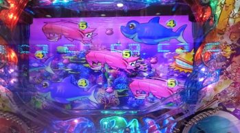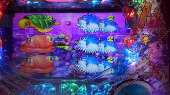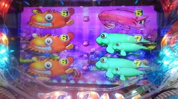12連目は、時短中の16回転、スペシャル魚群タイム突入前、「泡」+「ハリセンボン」×「カメ」→「カメ」5R確変当たり。