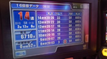 最初の3連は出玉を飲まれました。その次は時短で2度引き戻して一撃ストレート14連しました。
