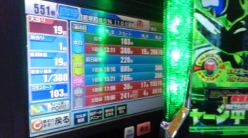 次に1台打った後に座ったのは、初当たり1回目が380回転で、19連して104回転の「ウルトラ6兄弟RUSH」後即ヤメ台でした。