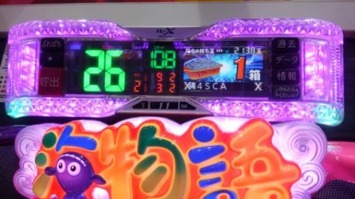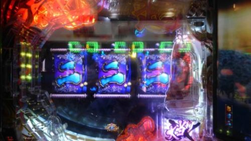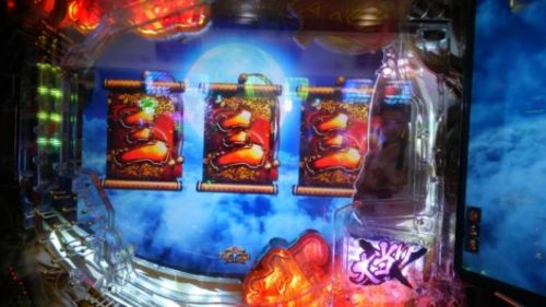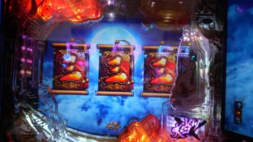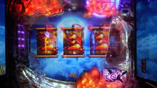 持ち玉投資の打ち出し2回転の283回転、入賞時フラッシュ「赤」+エアーバイブ+「赤」満月保留+真実の親子愛リーチ→「三」当たり。SUPER小当たりRUSHは超確変当たりにしかついてこないので、少し、派手になったミドル機の演出を消化します。