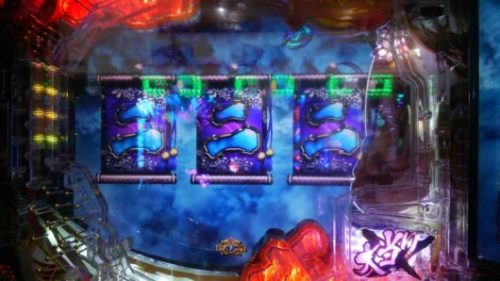 2連目は40回転で「青満月」保留+「三」テンパイ+集結リーチ→「三」当たり。