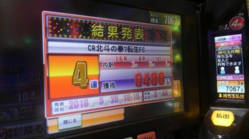 0回当りの644回転の台でした。「お座り一発」、1回転目の投資0.5Kの645回転、「赤」七星ギミック+「赤」保留+回想連続疑似連×3+ケンシロウVSカイオウ+キリン柄カットイン→「4」当り。