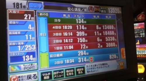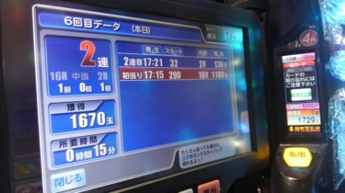 初当りが72回転で2連。2回目が750回転で6連。3回目が399回転で11連。169回転で空いていた台でした。